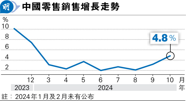 【明報專訊】內地10月零售增速加快,國家統計局公布,零售銷售總額按年增長4.8%,好過市場預期的3.8%,為今年2月以來最快的增速,其中過往增速較弱的商品零售按年增5%,為去年11月以來最高。首10個月固定資產投資增速為3.8%,連續3個月企穩,統計局新聞發言人、國民經濟綜合統計司負責人付凌暉表示,內地經濟回升勢頭增強、宏觀政策效應顯現、市場預期信心提振,特別是從10月份經濟運行變化,進一步增強了實現全年經濟發展目標的信心。