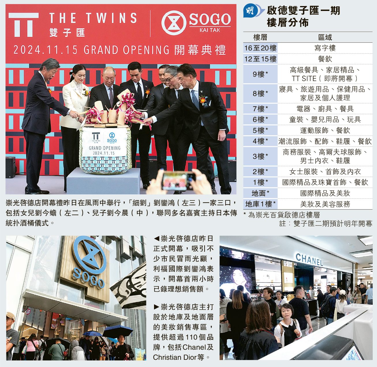 【明報專訊】九龍新興住宅及商業區啟德,再有大型全新商業項目落成;於2016年底成功投地、利福國際發展的啟德雙子匯,第一期崇光百貨(SOGO)昨日在風雨中開幕,但崇光啟德店定位與銅鑼灣店稍不同,暫未見國際頂級奢侈品牌進駐。利福國際集團主席兼執行董事劉鑾鴻表示,該店亮點是設有東九龍最大規模的美妝銷售區域,而對當年以全港最貴商業地姿態投得地皮,他認為地價不算高,項目總投資額即使超過150億元,回本期必定超過10年,但實際回本期並不是集團最重要考慮因素,而是希望項目「長做長有」。