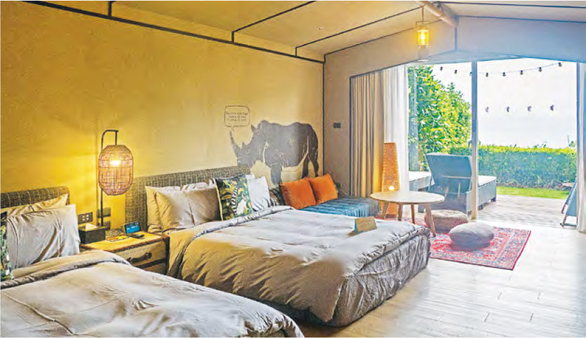酒店的「探索庭園客房」可住2至4人,牆壁、咕𠱸等均有野生動物案,免費供應的小吃則放在野餐籃內,杯子用上金屬露營杯;外面小陽台設有小帳篷和太陽椅。酒店亦設有適合不同年齡兒童玩樂的遊戲室「Rich Fun瑞奇活力館」,以及設備齊全的健身室和室內外游泳池、spa,大人也不愁沒節目。●