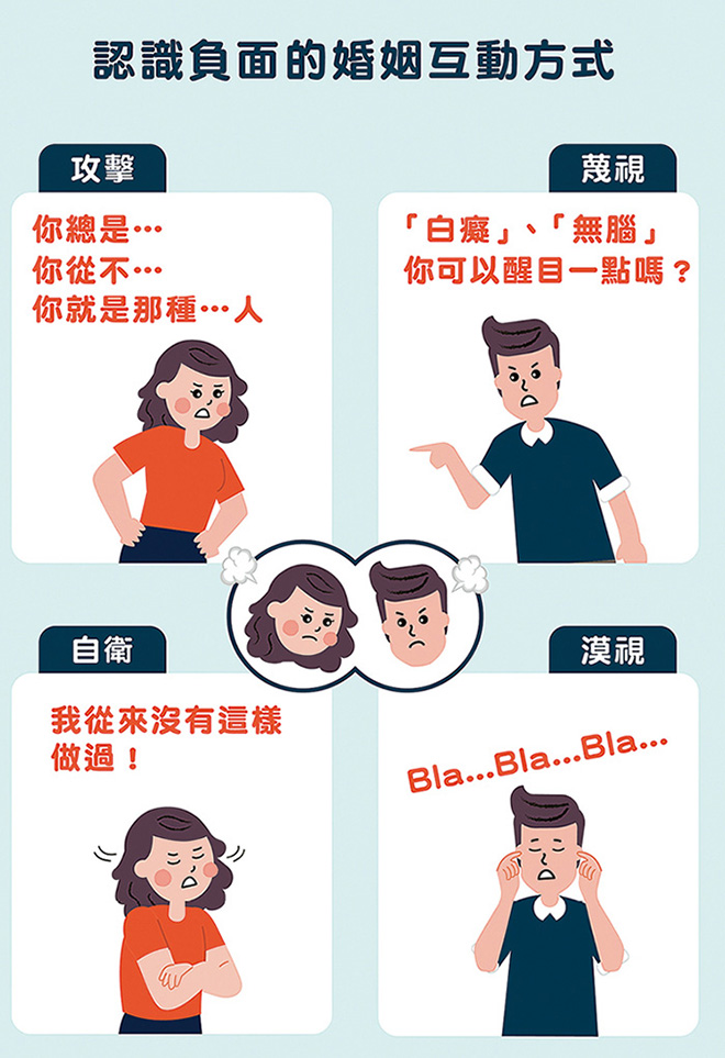 【明報專訊】美國婚姻大師John Gottman綜合多年的研究結果和臨牀經驗,發現4種特別負面的婚姻互動方式,包括攻擊、蔑視、自衛和漠視。研究顯示,夫婦之間愈經常出現這些負面互動,他們對婚姻的滿足感就愈低,離婚率則愈高。