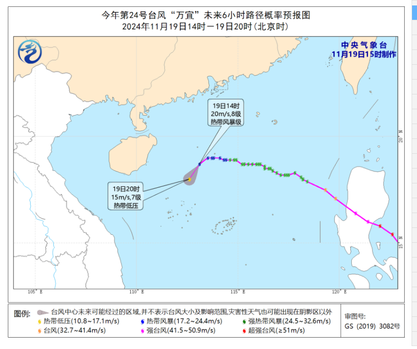 19日下午2時,「萬宜」距離海南省三沙市(西沙永興島)北偏東方向約220公里,強度為熱帶風暴級,將以15至-20公里時速向西南方向移動,強度快速減弱。(新華社、中央氣象台)