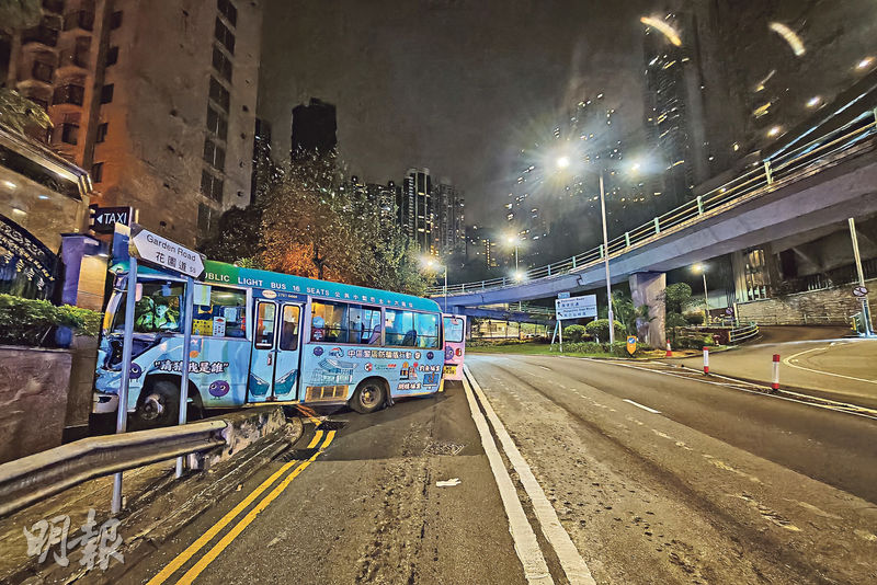事發於前晚11時許,1號線專線小巴沿花園道下斜,駛至愛都大廈對開右急彎時失事,先撞毁路中分隔柱,再越過對面行車線撞向屋苑外牆花槽,司機拋出車外,倒臥車底昏迷。消防及救護員到場,79歲姓張男司機頭部受傷,送瑪麗醫院搶救。