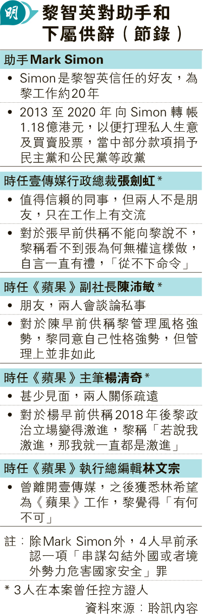 另外,黎智英供述對助手Mark Simon以及在本案認罪的時任《蘋果》高層的看法。他形容,Mark Simon和時任《蘋果》副社長陳沛敏都是他的朋友;時任壹傳媒行政總裁兼《蘋果》社長張劍虹雖為值得信賴的同事,但不是朋友;至於時任《蘋果》主筆楊清奇,黎稱甚少與對方見面,關係疏遠。