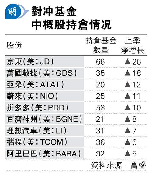 高盛:對冲基金增中概股持倉