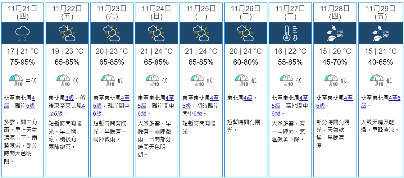 即時熱點 天氣|天文台:今早市區約17°C 下午雨勢減弱 (08:24) 發佈於 1 年 前 2024 年 11 月 21 日 By 明報 上午8時10分,天文台錄得18.0°C,相對濕度95%。東北季候風正為廣東沿岸地區帶來清涼的天氣。本港今早(21日)市區氣溫在17°C左右,新界再低一兩度。此外,一道廣闊雲雨帶正覆蓋華南沿岸。 本港今日天氣預測多雲,間中有雨,早上天氣清涼,下午雨勢減弱,部分時間天色明朗,最高氣溫約21°C。吹和緩北至東北風,離岸風勢清勁。展望未來一兩日天色較為明朗,日間氣溫稍為回升。周末至下周初風勢頗大。(天文台) 相關文章:天文台天氣天氣速遞編輯推介 Up Next 天氣|天文台:周五短暫有陽光 最低19℃ 下周中期跌至14℃ (19:50) 不要錯過 劍橋詞典2024年度字「Manifest」 一文認識「Manifest」意思及流行原因 (09:27) 繼續閱讀 贊助商 猜你喜歡 天氣|天文台:周日早上市區最低14℃ 部分地區寒冷 (17:55) 天氣|天文台:多雲有幾陣雨 今晚轉涼降至約17℃ (09:25) 【Emily】天文台「矚目天氣及氣候事件選舉」 投票有機會獲紀念品 天氣|天文台:周六多雲有雨 晚上轉涼氣溫17至21°C 下周日跌至最低14°C (21:22) 天氣|天文台:短暫時間有陽光 最高19°C (08:24) 天氣|天文台:周四多雲早晚有微雨 氣溫介乎17至20°C (20:57)