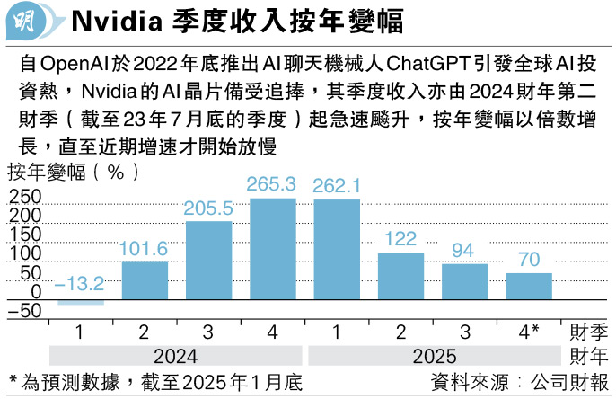 【明報專訊】受惠於AI基礎設施的投資熱潮,AI晶片龍頭Nvidia(英偉達)(美:NVDA)季度收入及利潤繼續大幅增長。在截至10月27日的2025財年第三財季,收入按年增長94%至351億美元,利潤按年增長109%至193億美元,兩者均超出分析師預期。加上Nvidia強調,未來的銷售增長引擎——新一代Blackwell AI晶片生產已步入正軌,推動Nvidia股價早段曾漲至152.89美元創新高。