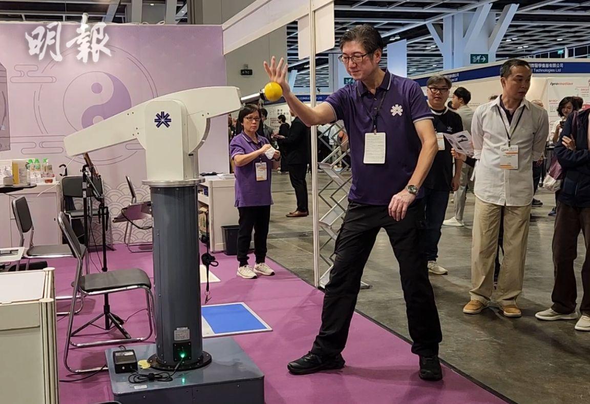 由興倫樂齡科技有限公司研發的太極推手機械人模擬太極師傅動作,與使用者練習推手,助長者強化肢體協調,改善平衡防跌。研發經理徐沛湧稱,機械人有約16個招式,目前在政府康健中心應用,團隊亦研發了新一代更輕巧、可調節高度的機械人,方便坐輪椅的長者使用,將會正式生產。