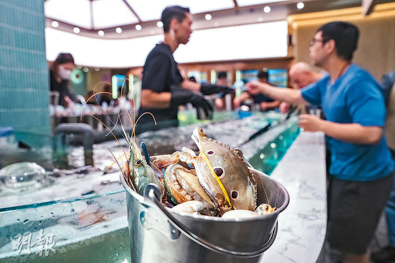 踏入餐廳,第一時間被眼前的海鮮魚缸吸引。約長達8米的即撈海鮮區包羅萬有,從花蟹、三點蟹、大頭蝦,到鮑魚、白蜆、沙白等10多款鮮活海鮮每日供應。Man透露,各款海鮮由內地進口,由3至4間供應商在每日不同時段送到,確保貨源充足,且有專人驗收把關,若不符合標準便會退回。根據記者當日觀察,每當海鮮缸清空至一半左右,店員便會立即補貨,確保海鮮量充足。