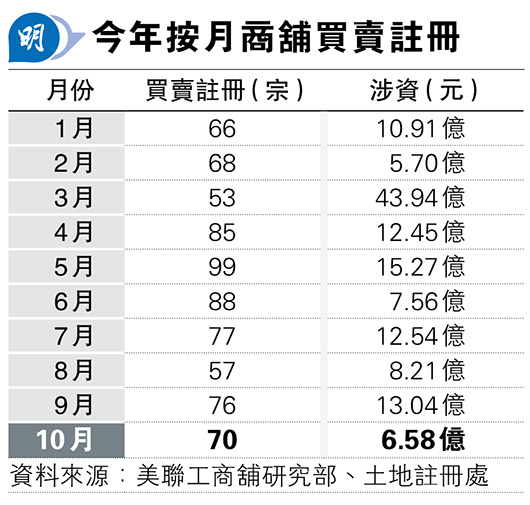 據統計,上月商舖買賣註冊宗數錄70宗,按月跌6宗或約7.9%;同期買賣註冊金額錄約6.58億元,相對9月錄逾13億元,按月減少6.46億元或49.5%,為今年2月錄約5.7億元後的8個月低位。