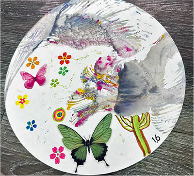 數月前,偉祥參加了一個蟹足腫患者的藝術治療工作坊,和其他患者分享交流,形容十分「療癒」。他亦畫了一幅比較抽象的畫,解釋說:「中央部分類似花瓣,我在周邊加上葉子及蝴蝶作為點綴,而花瓣旁邊我畫了一個類似金龍的龍頭,長有像鳳凰的翅膀。整幅畫最終看上去像花又像鳳凰,所以我感覺做這些創作自己可以隨意加很多不同的元素在裏面,有很多不同變化。」