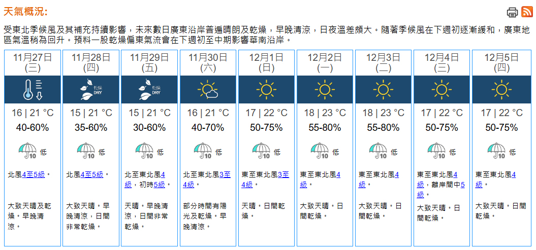【22:30】東北季候風正為廣東帶來普遍晴朗及乾燥天氣。本港地區今晚(26日)及明日(27日)天氣預測:大致天晴及乾燥,早晚清涼,明日市區最低氣溫約16°C,新界再低兩三度,日間最高氣溫約21°C。吹和緩至清勁偏北風。展望隨後兩三日大致天晴及非常乾燥,早晚清涼,市區最低氣溫15°C左右,新界再低兩三度,日夜溫差頗大。[一文看洋葱式穿衣法、戶外運動穿衣注意]