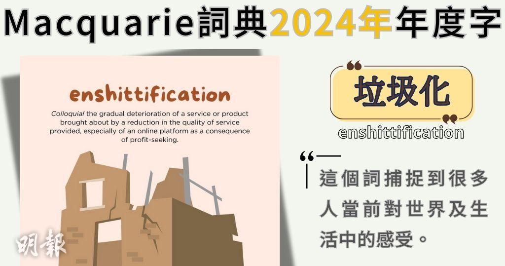 澳洲詞典Macquarie Dictionary周一(25日)公布2024年年度字為「垃圾化(enshittification)」,意思為網上平台服務商為追求利潤,降低服務或產品質量所帶來的惡化狀況。據《衛報》指出,這個字由科技評論員Cory Doctorow於2022年創造。Macquarie詞典認為,這個字捕捉到很多人當前對世界及生活中的感受。