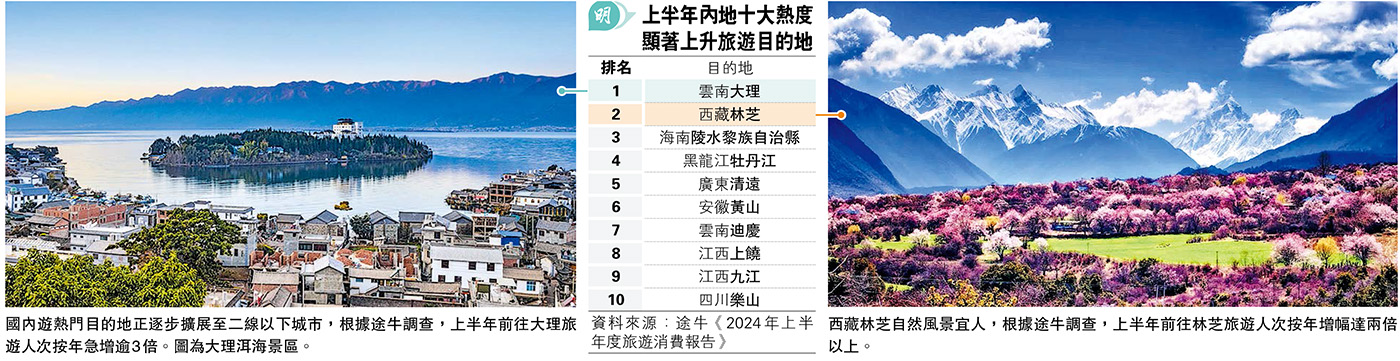 根據途牛《2024年上半年度旅遊消費報告》顯示,內地隨着旅遊消費需求持續增長下,追求差異化和個性化的「下沉式旅遊」興起,消費者傾向選擇小眾旅遊城市,國內遊熱門目的地正逐步擴展至二線以下城市,儘管今年上半年國內十大熱門目的地仍以一二線城市為主,分別為上海、北京、廣州、三亞、西安、南京、成都、重慶、杭州及蘇州,惟期內十大熱度顯著提升目的地(見表),則以二線以下城市為主,如大理、林芝、清遠、上饒及九江等,其中今年上半年前往大理旅遊人次按年增加逾3倍,而赴林芝、清遠、陵水黎族自治縣,牡丹江及黃山等目的地的旅遊人次按年增幅亦達兩倍以上。