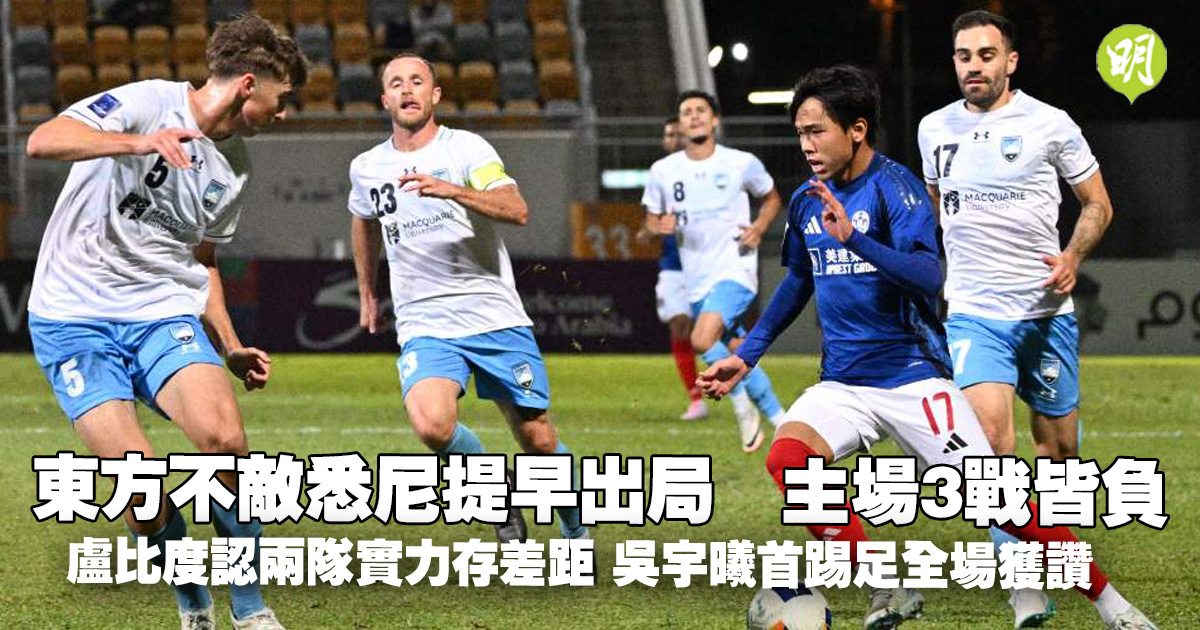 港超球會東方今晚(28日)在旺角大球場上演的亞冠盃2的E組第5輪,上半場連失3球下,換邊後縱有後備入替的前鋒巴科爾破蛋,仍以1:4不敵有前荷甲中場奧謙「戴帽」的澳職球隊FC悉尼,在E組戰績1勝4負,提早一輪出局,與G組的另一港超代表理文雙雙無緣16強。