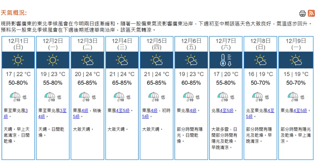 乾燥的東北季候風正為廣東帶來普遍晴朗的天氣。本港今早(11月30日)清涼,天文台錄得最低氣溫16.5°C,是今年入秋以來的最低紀錄。