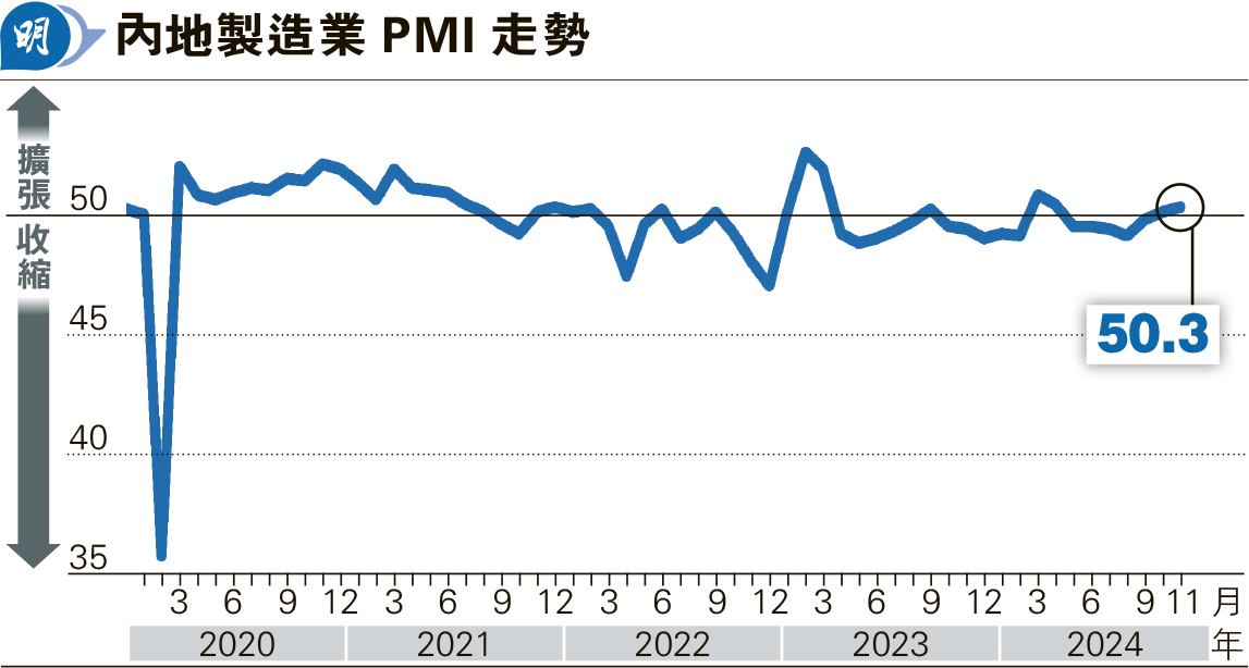 【明報專訊】隨着內地推出一系列剌激經濟政策,國家統計局公布,11月製造業採購經理指數(PMI)為50.3,按月升0.2,連續兩個月處於擴張水平,且連升3個月,見4月以來的7個月高位,從13個分項指數看,按月相比,9個指數升介乎0.2至1.7之間,4個指數降介乎0.2至3.6之間。至於非製造業商務活動指數50,按月下降0.2;綜合PMI產出指數50.8,按月持平。分析指出,總體保持穩定擴張,但需求不足,要進一步加強增量政策效果。