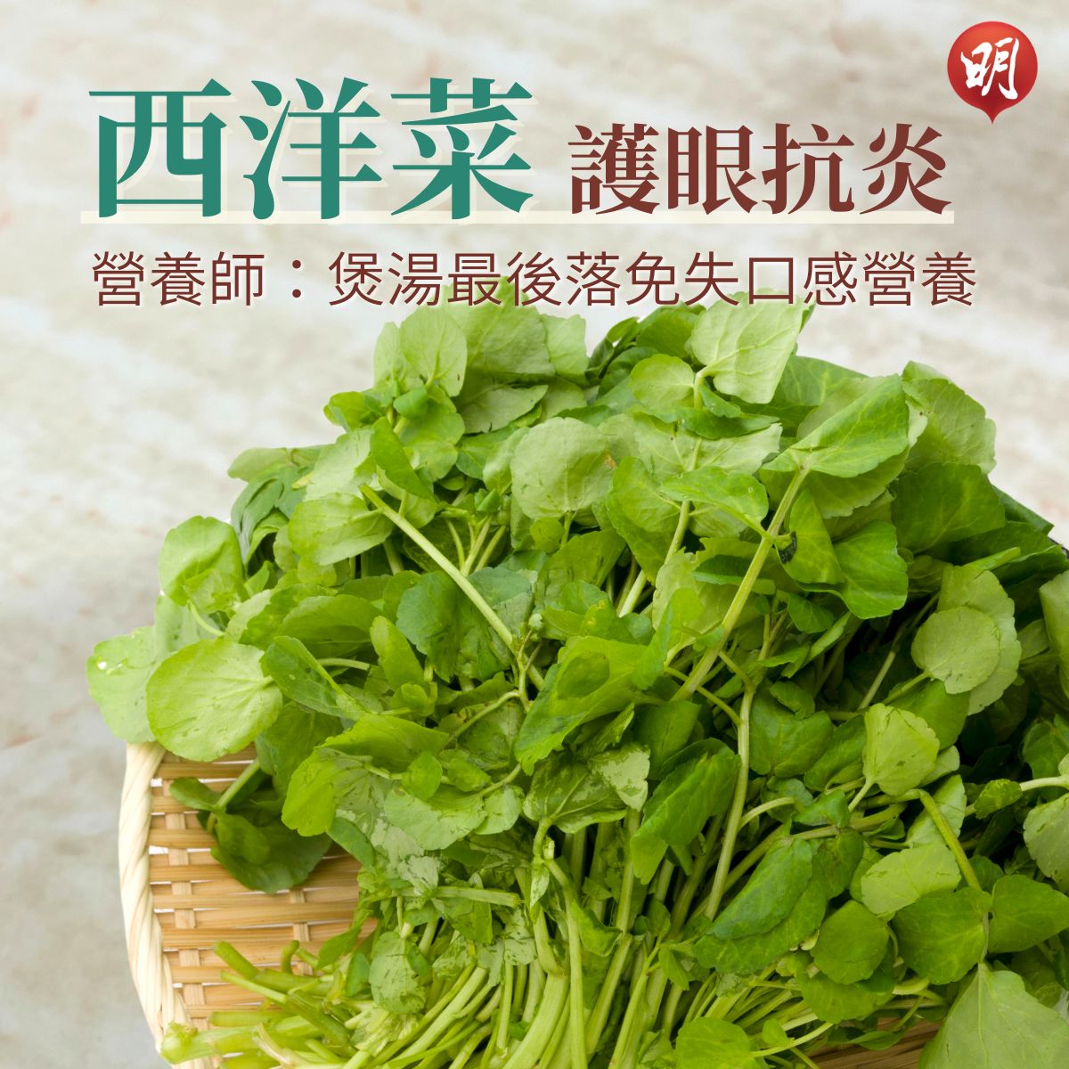 西洋菜冬天當造,不少人會用西洋菜滾湯飲或打邊爐,澳洲註冊營養師梁穎恩(Bonnie)接受明報電子平台組訪問,表示西洋菜是冬天蔬菜,有抗炎作用,可鞏固身體免疫力,減少冬天受感染生病,她講解西洋菜營養和煲湯時注意,提醒烹煮西洋菜宜控制在10分鐘內。