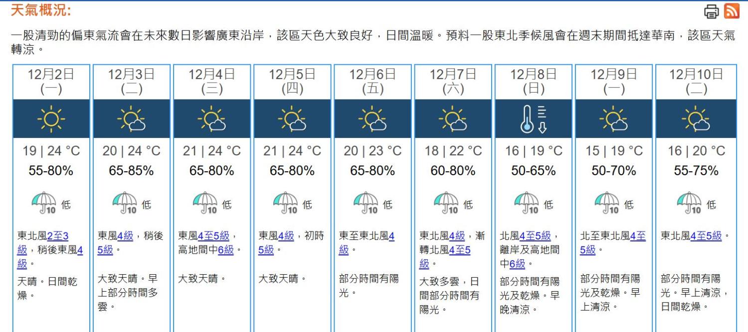 即時熱點 天氣|天文台:天晴乾燥最高24°C 未來數天日間溫暖 (08:37) 發佈於 1 年 前 2024 年 12 月 2 日 By 明報 上午8時30分,天文台錄得氣溫20°C,相對濕度70%。 華南天色普遍晴朗。本港地區今日(2日)天晴。日間乾燥,最高氣溫約24°C。吹輕微至和緩東北風,稍後轉吹和緩東風。展望未來數日大致天晴,日間溫暖。(天文台) 相關文章:天文台天氣天氣速遞編輯推介 Up Next 北海道獼猴浸溫泉 「泡澡粉絲」對水溫挑剔 遊客大讚可愛癒治【多圖】 (19:15) 不要錯過 冬天蔬菜|西洋菜護眼抗發炎 營養師:西洋菜滾湯最多煮10分鐘【附西洋菜湯食譜】 (09:44) 繼續閱讀 贊助商 猜你喜歡 天氣|天文台:非常乾燥 日間最高22°C (08:47) 「天琴」橫行南海 黃岩島大暴雨 (01:43) 天氣|天文台:非常乾燥最高23°C 明早市區降至約15°C (08:24) 天氣|天文台:周四天晴非常乾燥 市區最低17°C (21:11) 天氣|天文台:本港今早較昨日低兩至三度 日間非常乾燥 (08:23) 天氣|天文台:周三天晴非常乾燥 早上清涼市區最低17°C (20:58)