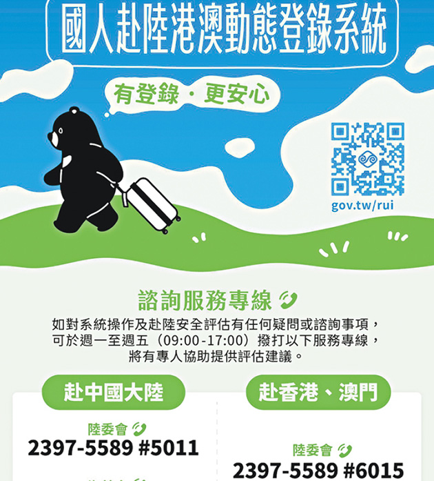 【明報專訊】台灣陸委會昨宣布,與海基會設置諮詢服務專線即日上線,由專人為台灣居民提供「赴陸港澳動態登錄系統」操作諮詢,以及作出安全問題評估建議;政府鼓勵台人赴陸港澳前登記資料,以利於遇緊急情况時,提供必要協助。