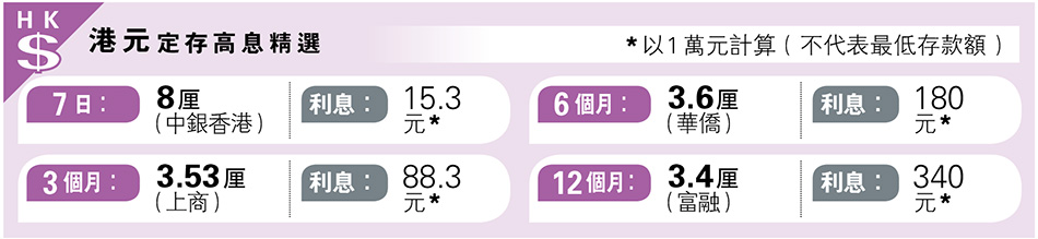 經濟 港元定存中銀香港7日年息達8厘 發佈於 11 個月 前 2024 年 12 月 4 日 By 明報 【明報專訊】港元定存高息精選7日高見8厘,為中銀香港「特優港元定期存款(以外幣兌換)」優惠之年利率。 (請看附圖) 相關文章: Up Next 《人民日報》:GDP增5%「左右」可接受 不要錯過 恒指升126點 北水淨流入飈5倍 繼續閱讀 贊助商 猜你喜歡