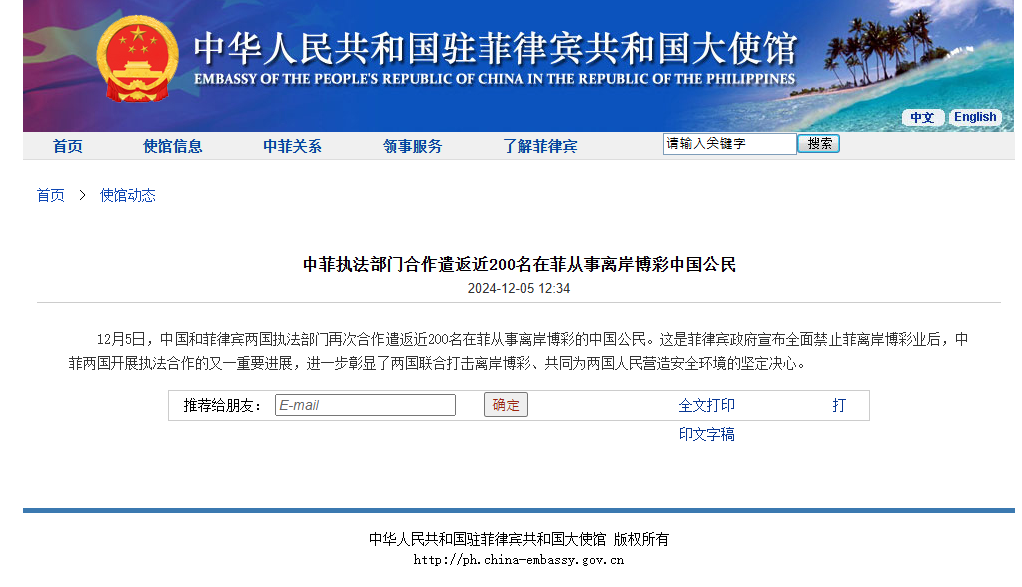 即時兩岸 200名在菲從事離岸博彩中國公民被遣返回國 (15:54) 發佈於 10 個月 前 2024 年 12 月 5 日 By 明報 中國和菲律賓兩國執法部門12月5日再次合作,遣返近200名在菲從事離岸博彩的中國公民。 中國駐菲律賓大使館當天發布通告表示,這是菲律賓政府宣佈全面禁止菲離岸博彩業後,中菲兩國開展執法合作的又一重要進展。 通告說,執法合作進一步彰顯了中菲聯合打擊離岸博彩、共同為兩國人民營造安全環境的堅定決心。(新華社) 相關文章:中菲編輯推介遣返離岸博彩 Up Next 特朗普提名戴維·珀杜為駐華大使人選 (16:04) 不要錯過 美國智庫會見國台辦主任 稱美政府換屆之際期望維護台海穩定 (00:36) 繼續閱讀 贊助商 猜你喜歡 菲參謀總長:中國若在黃岩島施工不會坐視 (20:29) 在美被捕逾300韓國黑工 未能如期周三遣返 (20:00) 美法院叫停遣返10危地馬拉童 白宮批阻團聚 解放軍戰備警巡黃岩島 (16:00) 華拖船現仁愛礁惹清場揣測 「先遞解後上訴」 英:擴涵15國罪犯