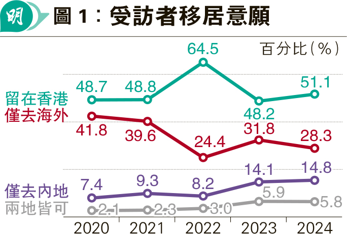 根據過去5年中大亞太所的電話訪問數據顯示,從2020到2024年,「僅移居外地」的比例從41.8%降到28.3%;「只移居內地」者則從7.4%升到14.8%;「兩地都去」的比例從2.1%漲至5.8%;「沒有移居打算」從48.7%攀至51.1%。倘不考慮2022年新冠疫情時受訪者移居傾向嚴重受壓,近5年內,今年「沒有移居打算」比例首次超過了半數(圖1)。