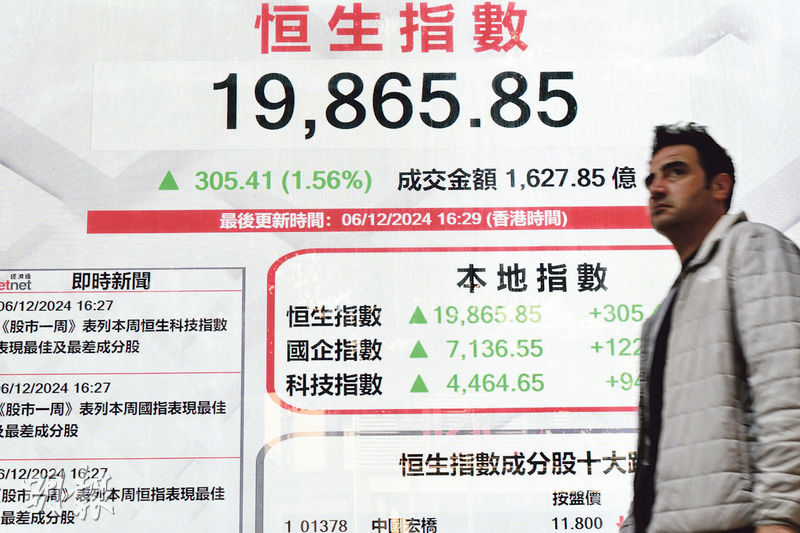 【明報專訊】中央經濟工作會議下周召開,市場憧憬將維持相對較高增長目標,並加大刺激經濟措施提振市場信心,資金偷步入市炒高港股及A股。加上美匯回軟,人民幣喘穩,恒指午後最多升近400點,反彈至近二萬點關口暫受阻,收市報19,865點,升305點,終止兩連跌。恒指換馬,成交增至逾1600億元。