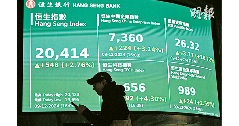 恒指昨低開133點後一直窄幅爭持,約3時20分過後,受中央政治局會議消息提振,恒指掉頭回升,最多升567點,高見20,433點,收市升548點,報20,414點,見近一個月新高。即月期指尾市升勢亦擴大,收市報20,650點,升717點;夜期續升190點,較現貨市場高水逾400點。