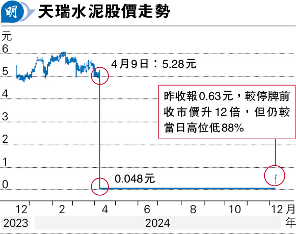【明報專訊】今年4月9日曾暴跌99%的天瑞水泥(1252)昨日(9日)獲聯交所批准在午市復牌。相隔8個月後復牌,天瑞水泥股價急彈,曾升1275%見0.66元水平,收市仍勁升1212.5%,報0.63元;半日成交5.75億元,換手率逾38%。天瑞爆升後,市值雖回升至18.5億元水平,但較4月8日暴跌前逾5元水平、市值逾140億元仍有大段距離。