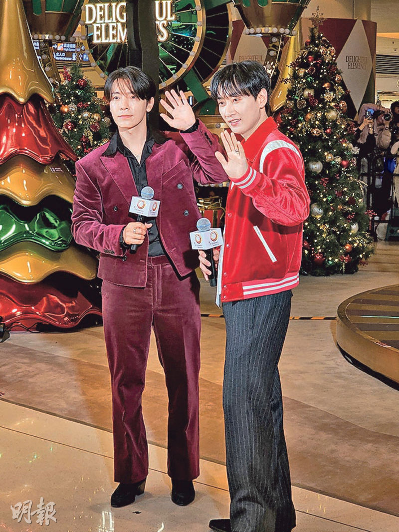 【明報專訊】韓國男團Super Junior(SJ)小分隊Super Junior D&E成員東海與銀赫,前晚(9日)出席西九龍某商場主辦的聖誕亮燈活動,吸引逾500名粉絲圍觀,場面墟冚。二人坐在旋轉木馬登場,用廣東話跟港迷打招呼,又不時派心心和飛吻,惹來粉絲尖叫。銀赫大讚商場聖誕燈飾漂亮,東海坦言感到幸福,大叫「今日是有史以來最難忘的聖誕節」。銀赫表示,曾與另一男團東方神起合作推出聖誕專輯《Show Me Your Love》,在充滿聖誕氣氛的主題樂園拍攝MV,印象難忘,更即場清唱幾句,粉絲即時起哄。
