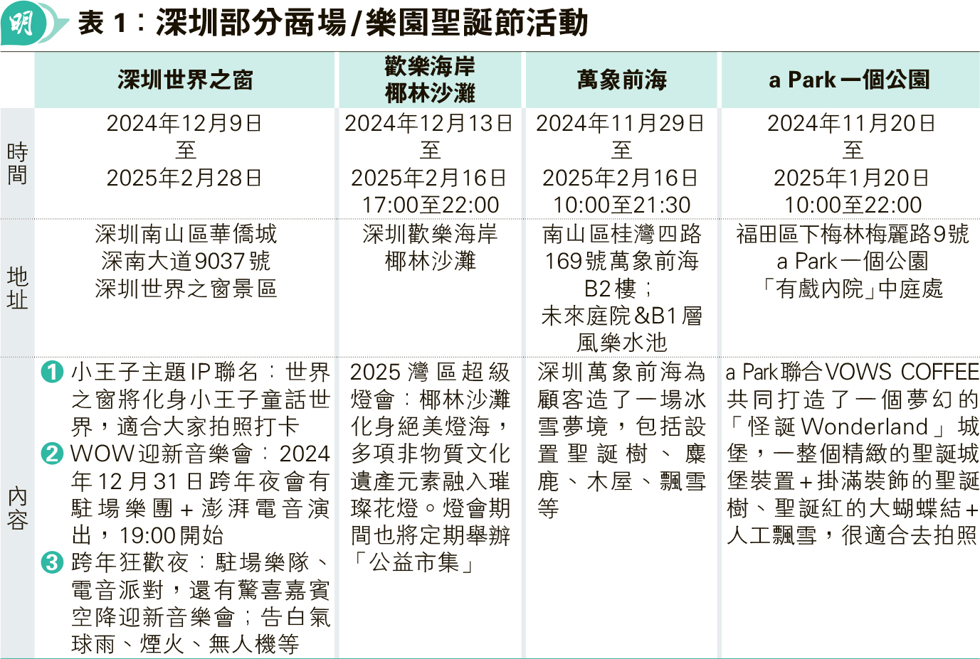 【明報專訊】聖誕節臨近,部分香港居民又在計劃北上度假。為了迎接這個佳節,深圳多家商場或主題樂園推出各式各樣的節日活動與優惠(見表1),讓遊客在購物、吃喝、玩樂的同時享受聖誕的喜悅。需要留意,深圳的酒店推出不少聖誕自助餐(見表2),價錢較平日貴,但相對香港部分酒店低。平安夜晚餐一般較聖誕正日(25日)貴100至200元人民幣,聖誕節北上想一家大細享受美食盛宴,可以揀聖誕節正日或Boxing Day(26日),會較划算。