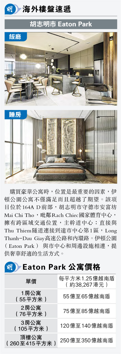 期內642個新公寓樓宇單位推出市場,按季下跌31%,按年則減少83%,而新推出的單位主要集中在胡志明市的東部及南部,大部分為中檔次住宅,佔77%,而豪宅則佔16%。至於售價方面,由於中檔次住宅主導銷情,有關平均基本售價亦按季下跌14%至每平方米3003美元 (折合每方呎2172港元),展望未來,隨着市中心供應愈見罕有,加上當地配合基建發展項目,預期東部將成為新公寓供應的要點,緊隨為南部及西部。