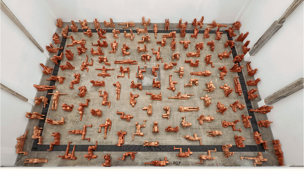 曾經擺放作品《屯蒙》深約23厘米海水與泥土的展廳,如今攤滿了以不同姿態躺下的磚頭人——今次展覽的核心作品《休憩之所II》,由132件用燒製黏土磚砌成的人形雕塑組成,大小如同真人,以不同躺臥姿勢散置於展廳中。「作品初看似一堆散亂的建築材料,逐漸演變成城市的模型。」安東尼認為或如危卵、或如高塔的磚塊,在堆疊出不同的人體形態之餘,亦呈現一種形如迷宮或廢墟城市般縱橫交錯的領域。而當參觀者走近這些靜態的「身體」,在其中漫步,便可從「動/靜」的相對視角觀察休憩狀態下的人體;而從2、3樓走廊俯瞰作品時,靜止的雕塑與穿梭其中的人群,似乎又會形成一片呈現人與建築空間張力的動態景象。