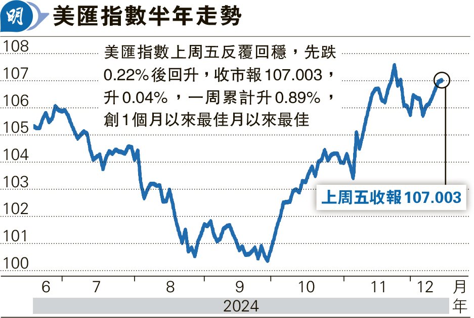 【明報專訊】市場憧憬美國聯儲局未來會放緩減息步伐,美匯指數上周五反覆回穩,先跌0.22%至106.719後回升,收市報107.003,微升0.04%,一周累計升0.89%,創1個月以來最佳。美元兌日圓上周五曾升0.77%至153.8日圓,是11月以來最強水平,本周累計升2.43%。