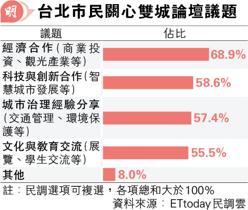 【明報專訊】台灣傳媒「ETtoday」昨日公布最新民調顯示,逾72%受訪台北市民支持舉辦雙城論壇;約63%受訪者認為,論壇有助緩和兩岸緊張局勢;約65%受訪者認為,兩岸關係愈緊張則愈需要對話。另外,近60%受訪者表示,不擔心雙城論壇成為中共統戰工具。
