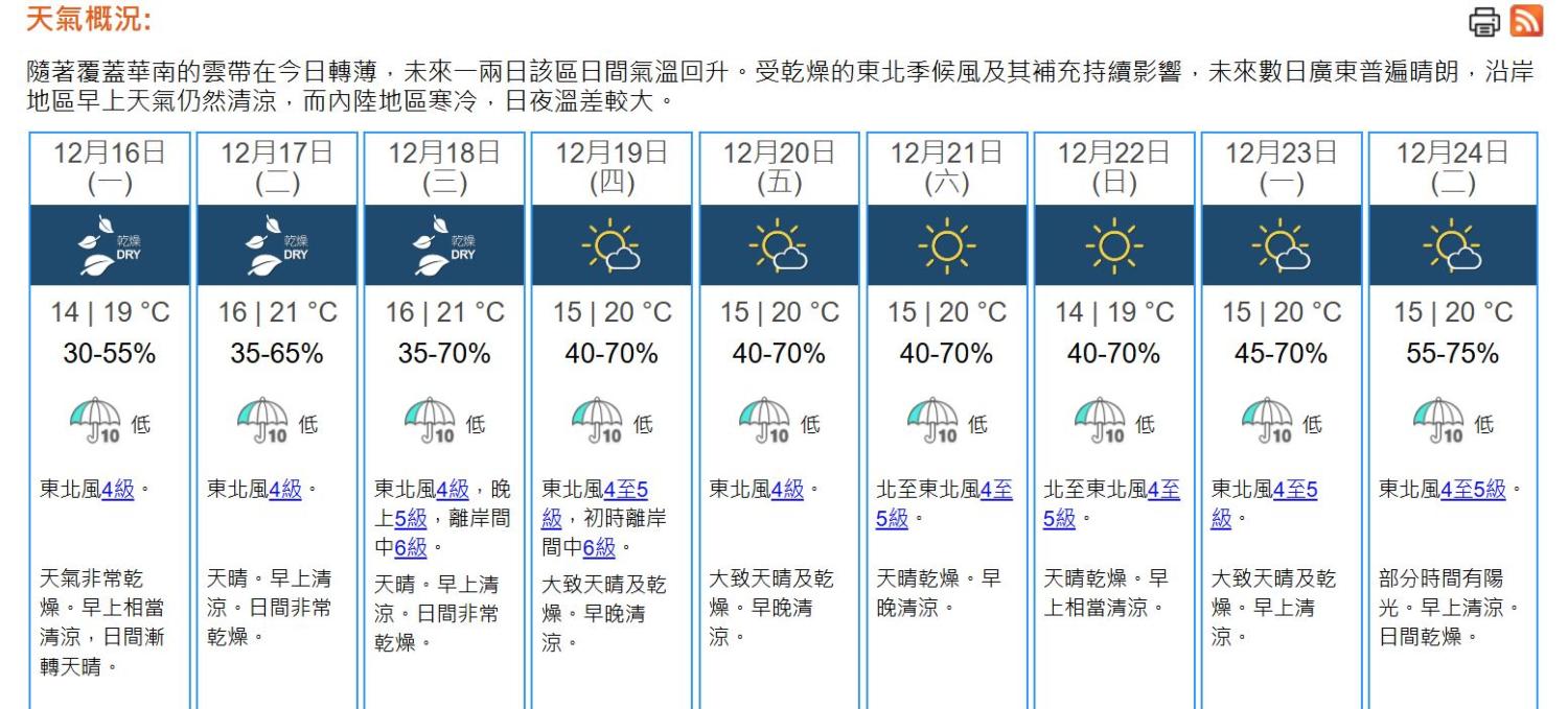 即時熱點 天氣|天文台:非常乾燥 日間最高19°C (08:43) 發佈於 1 年 前 2024 年 12 月 16 日 By 明報 上午8時30分,天文台錄得氣溫14.7°C,相對濕度41%。 乾燥的東北季候風正影響廣東。本港今早(16日)相當清涼,市區氣溫在13、14°C左右,新界再低一兩度。此外,覆蓋廣東沿岸的雲帶逐漸轉薄。 本港地區預測今日非常乾燥。早上相當清涼,日間漸轉天晴,最高氣溫約19°C。吹和緩東北風。展望未來兩三日天晴乾燥,日間氣溫回升,但早上仍然清涼,而新界內陸地區寒冷,日夜溫差較大。(天文台) 相關文章:天文台天氣天氣速遞 Up Next 天氣|天文台:周二15°C-21°C非常乾燥 冬至前後市區最低氣溫料14°C (22:15) 不要錯過 消委會.去頭皮洗頭水|13款去屑洗頭水表現最佳總評5分【附名單】 (12:43) 繼續閱讀 贊助商 猜你喜歡 天氣|天文台:日間乾燥溫暖 最高25°C (08:14) 天氣|天文台:周三大致天晴乾燥 市區最低19°C (21:08) 天氣|天文台:大致天晴 最高23°C (08:14) 天氣|天文台:周二天晴乾燥 早上市區最低18°C (20:52) 天氣|天文台:有陽光及乾燥 日間最高20°C (08:17) 寒潮 | 廣州最低氣溫跌至1.7℃ (16:58)