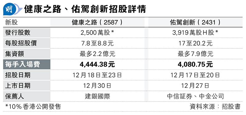 另外,內地智能駕駛和智能座艙解決方案供應商佑駕創新(2431)昨日(17日)起至20日招股,擬發行3919萬股H股,一成在港公開發售,招股價17元至20.2元,集資最多7.9億元。每手200股,入場費4080.75元,預計12月27日掛牌(見表)。聯席保薦人為中信証券(6030)、中金(3908)。