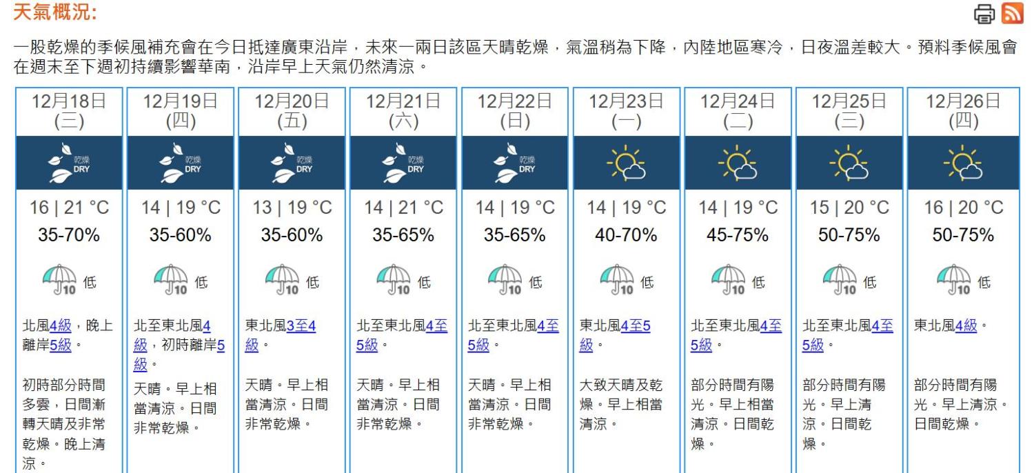 即時熱點 天氣|天文台:部分時間多雲 日間最高21°C (08:36) 發佈於 12 個月 前 2024 年 12 月 18 日 By 明報 上午8時20分,天文台錄得氣溫17.7°C,相對濕度50%。 乾燥的東北季候風正影響廣東。同時,廣東內陸的氣壓正在上升,預料一股東北季候風補充會在今日(18日)逐漸影響廣東沿岸。 本港地區今日天氣預測初時部分時間多雲,日間漸轉天晴及非常乾燥,最高氣溫約21°C。吹和緩偏北風,晚上清涼,離岸風勢清勁。 展望本周餘下時間至聖誕節早晚持續清涼,日間大致天晴及非常乾燥。周五(20日)市區最低氣溫在13°C左右,新界再低幾度。(天文台) 相關文章:天文台天氣天氣速遞編輯推介 Up Next 短片:江蘇南通市梧桐樹添「新毛衣」 90後設計師:盼在寒冬帶來溫暖 (20:29) 不要錯過 西九故宮館「當紫禁城遇上凡爾賽宮」展覽 近150件中法珍品亮相 路易十四致康熙親筆信「重現」 (09:02) 繼續閱讀 贊助商 猜你喜歡 天氣|天文台:非常乾燥 日間最高22°C (08:47) 「天琴」橫行南海 黃岩島大暴雨 (01:43) 天氣|天文台:非常乾燥最高23°C 明早市區降至約15°C (08:24) 天氣|天文台:周四天晴非常乾燥 市區最低17°C (21:11) 天氣|天文台:本港今早較昨日低兩至三度 日間非常乾燥 (08:23) 天氣|天文台:周三天晴非常乾燥 早上清涼市區最低17°C (20:58)
