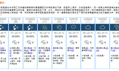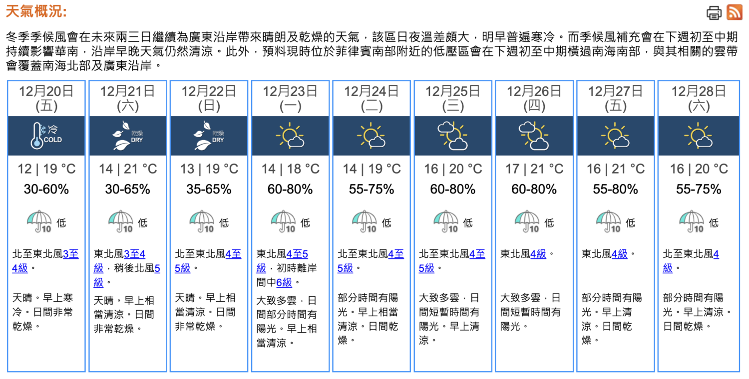 展望明早(20日)市區最低氣溫下降至13°C左右,新界再低幾度及普遍寒冷。周末期間早上相當清涼,日間非常乾燥。下周初至聖誕節早晚仍然清涼,日間部分時間有陽光。(天文台)
