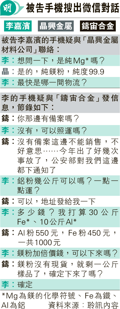 此外,涉事手機機主的微信名稱為Ben,曾與多間內地原材料供應商發信息(見表)。機主以製作「還原劑」為由,向供應商查詢購入鎂粉、鋁粉、碳纖板和氧化鐵粉等,其間機主傳送大角嘴宏創方的地址,並附上李嘉濱的名字,有內地公司稱呼機主為「李總」。從對話可見,機主向一間公司訂購30公斤Fe粉、10公斤Al粉和1公斤鎂粉,涉款1500元,雙方曾發送支付寶二維碼和寄件單據。