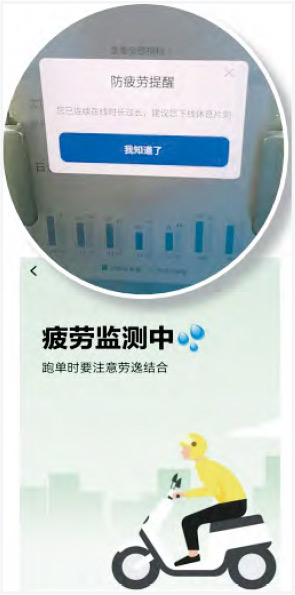 多名騎手反映,專職騎手每日工時多為八九小時,配送約25至30單。對兩大平台推出防疲勞機制,騎手反應不一。美團騎手章程表示理解和支持,稱長時間、長距離駕駛下,疲勞會帶來很大風險。