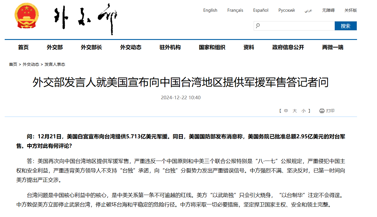 外交部發言人今(22日)表示,美國再次向中國台灣地區提供軍援軍售,嚴重違反一個中國原則和中美三個聯合公報特別是「八·一七」公報規定,嚴重侵犯中國主權和安全利益,嚴重違背美方領導人不支持「台獨」承諾,向「台獨」分裂勢力發出嚴重錯誤信號。中方強烈不滿、堅決反對,已第一時間向美方提出嚴正交涉。