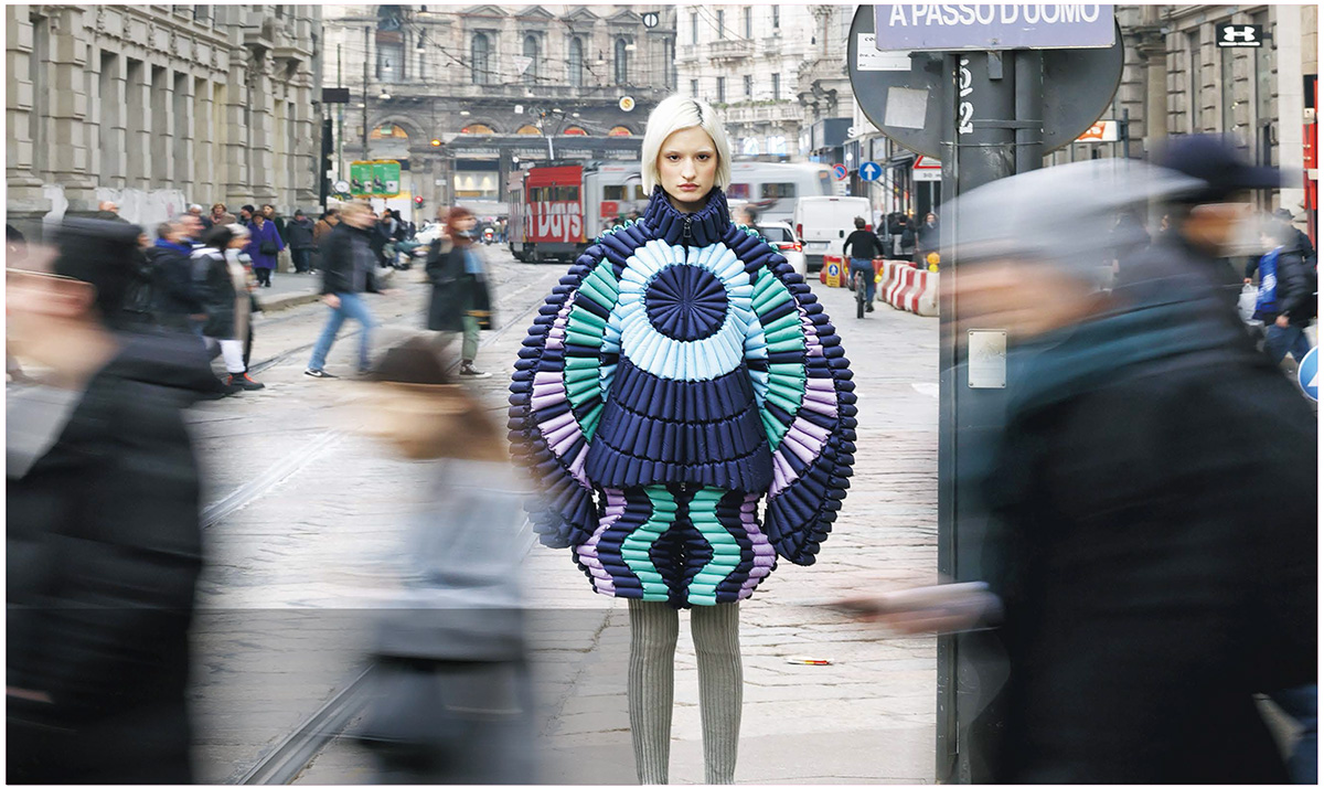 William以數理邏輯思維跨界來設計服裝,並有借助於AI演算法。他娓娓道來其創作歷程。「RAXXY的設計在前期並沒有用到傳統時裝的常用工藝,比如印花,刺繡,提花等。我們都是通過自身的專利工藝來表達設計。所以在尋找每一季的靈感時,還需要配合我們自身工藝來做一些實驗,而靈感就從中而來。在整個設計的演化過程,其實是有兩條線索的,其一是色彩,以此追求整個系列統一的感覺。另外就是以工藝來表達衣服形態,簡單來說是雕塑形態線。」他形容RAXXY的核心是「維新時裝」,是一個塊狀結構的體系,以塊狀結構塑造雕塑感。