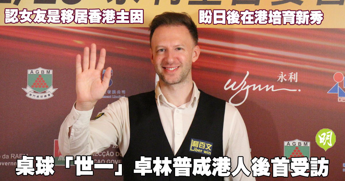 人才服務辦公室昨公布,現時世界排名第一的英國桌球手卓林普(Judd Trump)經優才計劃獲得香港居民身分。綽號「準神」的他趁聖誕檔期出戰澳門桌球大師邀請賽,今早(25日)接受本地傳媒訪問,承認港人女友是定居香港的主要原因。他又認為,明年3月在啟德體育園上演的世界大獎賽,將是他在香港履行推廣桌球運動使命的首個機會。