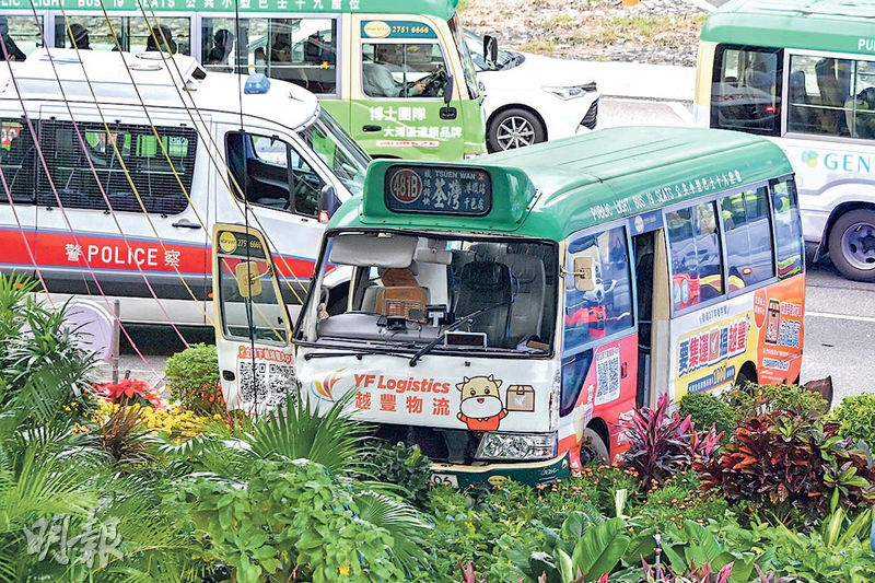 【明報專訊】大圍車公廟路近美田路迴旋處昨午發生交通意外,兩輛專線小巴疑於路口相撞,其中一輛衝前近100米橫越3線,剷上迴旋處花槽停下。意外中9人受輕傷,包括剷上花槽的小巴司機,意外起因有待警方調查。