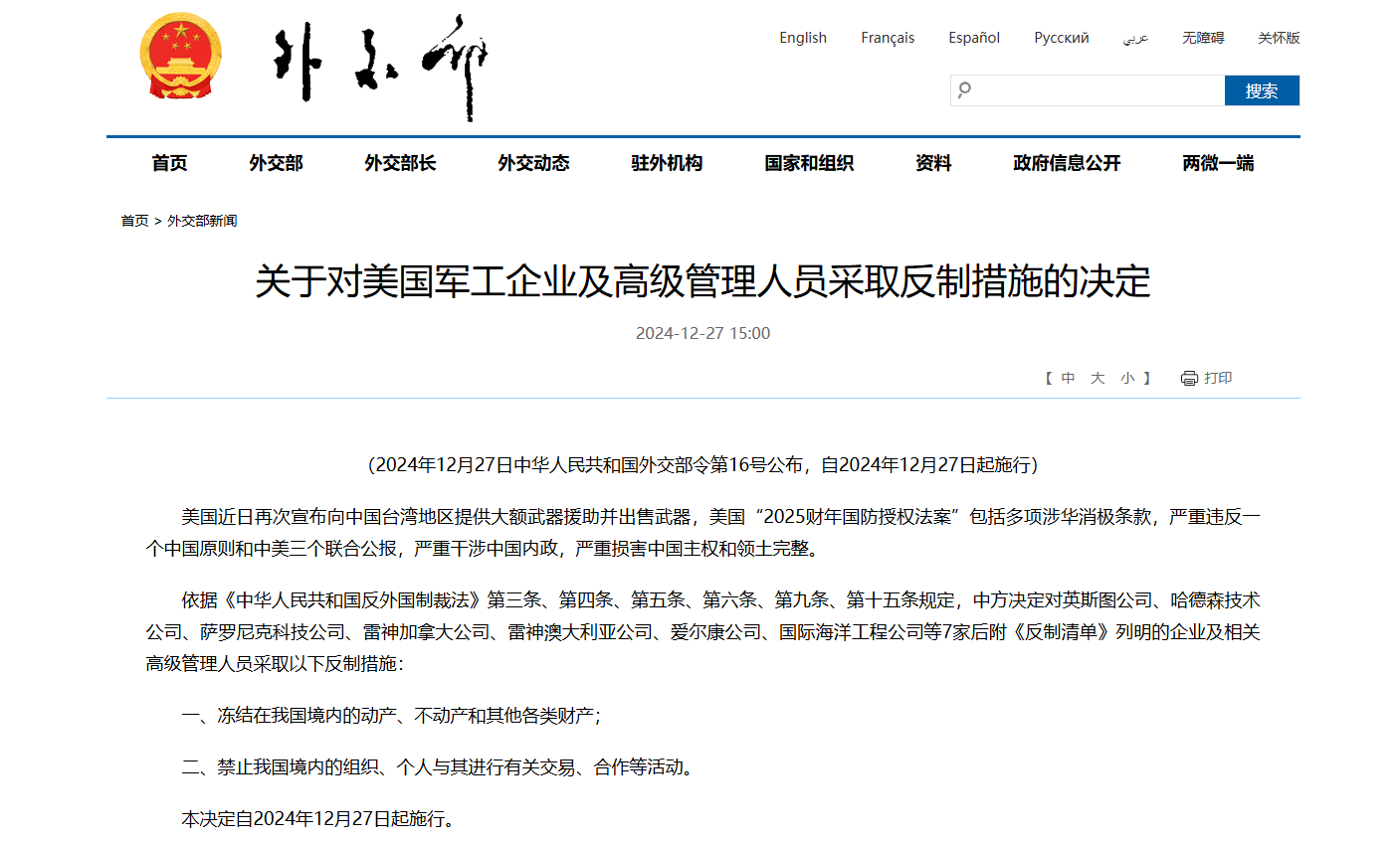 中國外交部12月27日宣布對7家美國軍工企業及高級管理人員採取反制措施,即日施行。