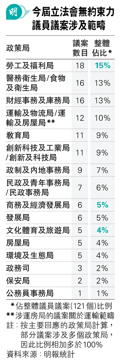 綜觀今屆121項議員議案,共有18項與勞福局相關,是各政策局中最多;其次是醫衛局/前食衛局,以及財庫局,各有16項議案涉及它們。吸引企業、投資和旅遊是現屆政府施政重心,今屆立法會相關的議員議案分別只有6項和5項。