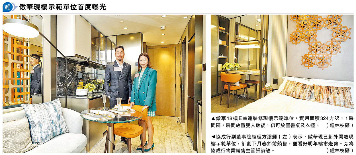 新年前夕,發展商協成行率先向傳媒開放傲華3個現樓示範單位,並隨即對外開放。被問到對明年樓市展望,協成行副董事總經理方添輝表示,政府多個利好樓市的因素,加上減息,看好明年樓市將有約2%至3%升幅。協成行物業銷售主管張詩敏表示,樓盤最快下周更新價單,期望明年能夠「打響頭炮」,項目價錢會參考區內一手成交,當中部分開放式單位的折實價有機會低於350萬元。
