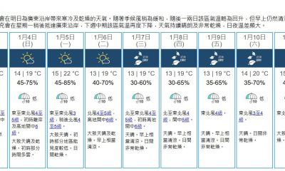 【21:10】本港地區今晚(12月31日)及明日元旦(1月1日)天氣預測:大致多雲。明日日間短暫時間有陽光,晚上有一兩陣微雨。明日氣溫介乎17-20°C。吹和緩至清勁東至東北風,明日初時高地間中吹強風。展望周四(1月2日)大致多雲,部分時間天色明朗。隨後兩三日天晴乾燥,早晚清涼,日夜溫差頗大。(天文台)