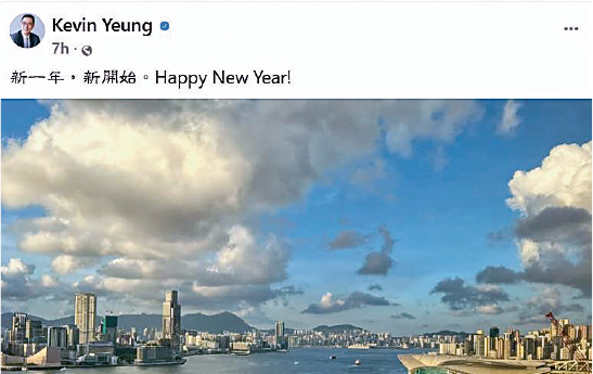 【明報專訊】文化體育及旅遊局前局長楊潤雄上月5日被免職,當日早上隨即喺社交平台上載一幅維港相片,寫上「謝謝大家關心!天空海闊,踏上人生另一階段」。事隔近一個月,楊潤雄喺元旦日再喺facebook發帖,上載另一張維港相,影住會展方向,今次就寫上「新一年,新開始。Happy New Year!」(見圖)。